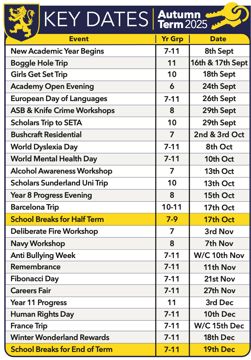 Below you will find a list of key dates for each term. This includes parents and awards evenings as well as other important events throughout the school year. Key dates will be published near the start of each term. You can click on each image to download a separate PDF if you wish.