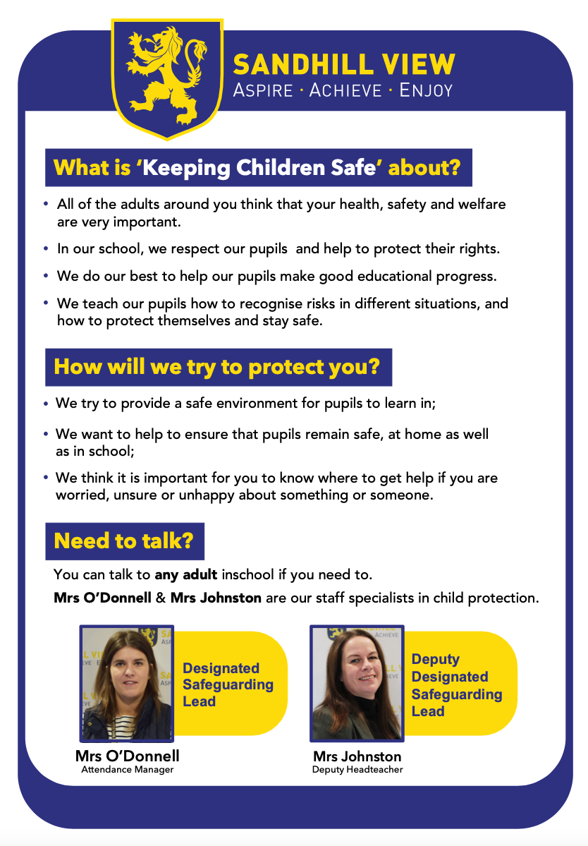 At Sandhill View we have a strong culture of ‘safeguarding’ that runs throughout every level of our staff. Safeguarding is the action that is taken to promote the welfare of children and protect them from harm. Safeguarding means: protecting children from abuse and maltreatment, preventing harm to children’s health or development and ensuring children grow up with the provision of safe and effective care.